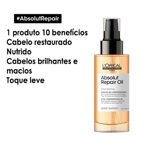 O Óleo Reparador L’Oréal Professionnel Serie Expert Absolut Repair Gold Quinoa 10in1 foi desenvolvido especialmente para cabelos danificados. Seus principais ingredientes, a Quinoa Dourada e Proteína Hidrolisada de Trigo, criam um filme protetor que mantém as cutículas seladas, retendo as propriedades restauradoras dentro da fibra capilar.