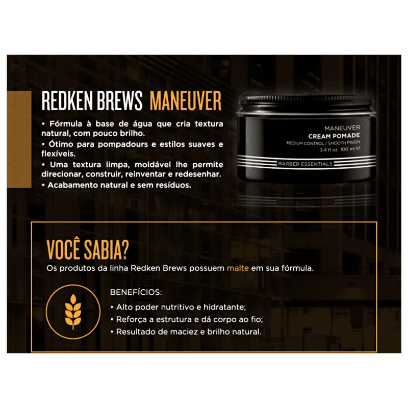 A Pomada Modeladora Brew Maneuver Cream Pomade da Redken conta com uma fórmula a base de água para melhor penteado e remodelagem.