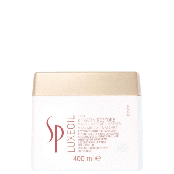 SP Luxe Oil Keratin Restore Mask da Wella é uma máscara reconstrutora que fortalece a queratina e alinha as fibras do cabelo.