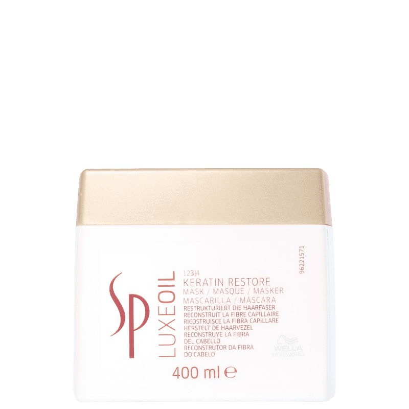 SP Luxe Oil Keratin Restore Mask da Wella é uma máscara reconstrutora que fortalece a queratina e alinha as fibras do cabelo.